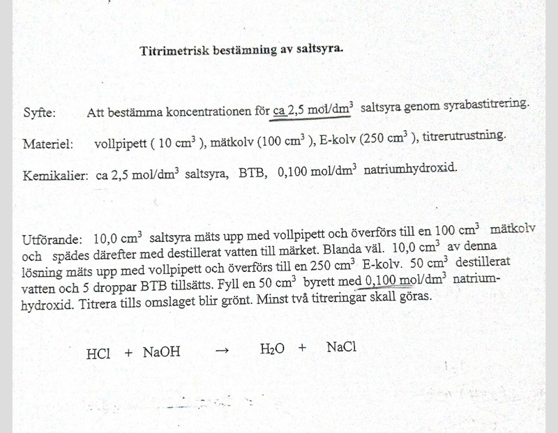 jag förstår inte vad menar med frågan. "Att bestämma koncentration för ca 2,5 mol/dm^3 saltsyra"