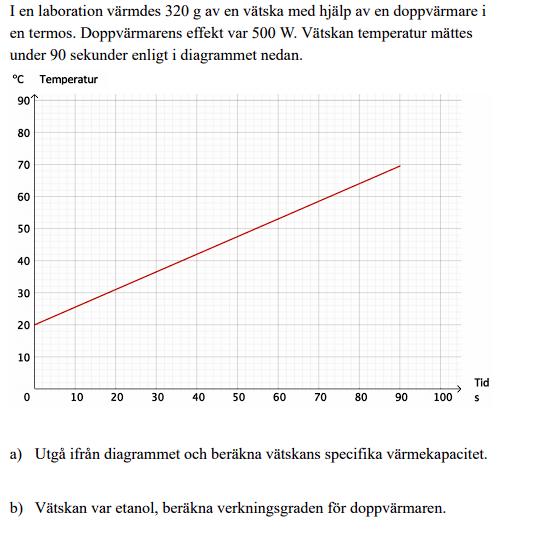 Jag förstår att 45000 joule användes totalt under 90 sekunder, sedan vet jag tempratursskillnaden på 90 sekunder, men jag förstår inte riktigt hur jag ska göra. Ge mig gärna tips på hur man kan tänka på graf uppgifter gällande värme.