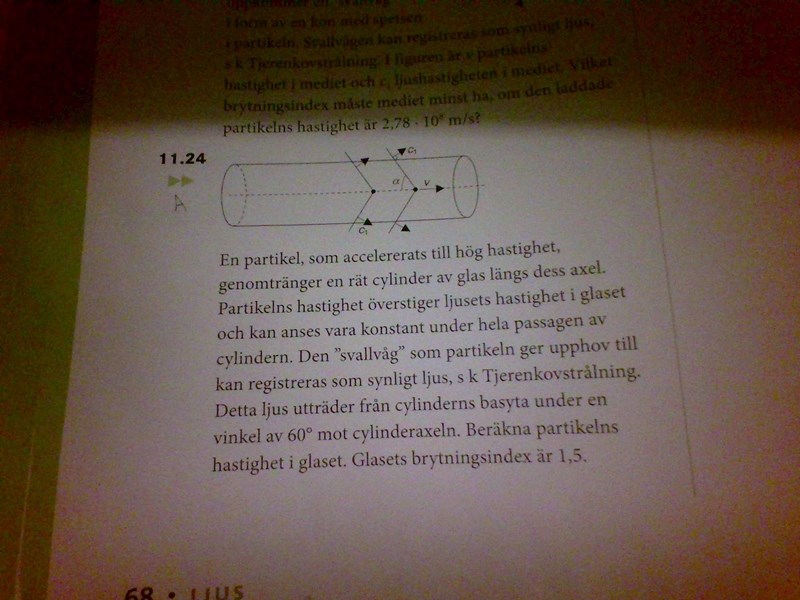 Tänkte också att jag kunde anta att ljushastigheten var c, men det svaret är aldeles för lågt ifrån facit. Vid en liknande uppgift för ljudets svallvåg behövde man hitta en formeln för sambandet mellan vinkeln a och förhållandet mellan partikelns hastighet och ljudets, då var svaret sin(a)=ljudets hastighet/ partikelns. Jag tillämpade därför samma formel för denna uppgift men vet inte om den delen är korrekt.