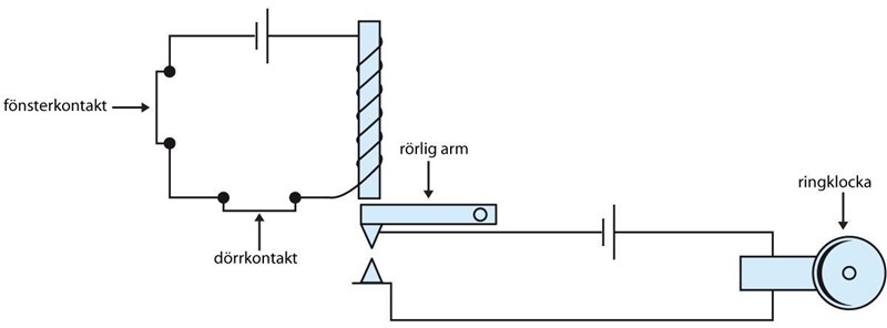 Nja, alltså det är en rätt avancerad krets. Om dörren och fönster är stängda så är den vänstra kretsen sluten. Det betyder att ström går genom kretsen. På grund av det så skapas ett magnetfält i spolen och kärnan i spolen blir magnetisk. Sekunden jag öppnar dörr eller fönster så bryts kretsen och ingen ström går genom den. Eftersom vi då inte har någon ström så kommer elektromagneten sluta fungera, och kärnan slutar vara magnetisk. Eftersom spolen attraherar armen så kommer den när kretsen bryts att ramla ner och sluta den andra kretsen som gör att larmet ringer.