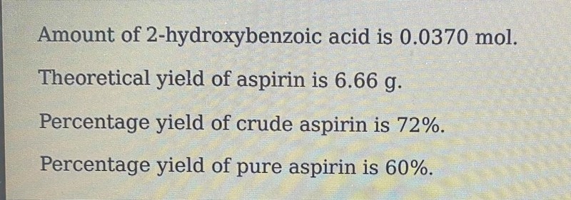 Jag gjorde en labb via nätet där jag syntetiserade aspirin, därefter gjorde jag tlc via nätet och tlc analysen beräknades som ovan, dock förstår jag inte hur man får 60% på percentage yield of pure aspirin. Mängden produceras acetylsalicylsyra var 4,75g