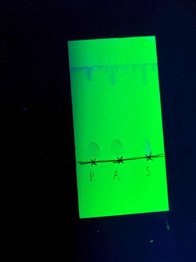 jag har gjort en laboration där jag har låtit Salicylsyra reagera med Ättiksyraanhybrid för att framställa Acetylsalicylsyra, och det är det som är belyst på TLC plattan, jag har även räknat ut utbytet vilket gav mig ungefär 73% (om det skulle vara viktigt att veta)