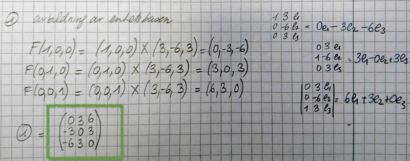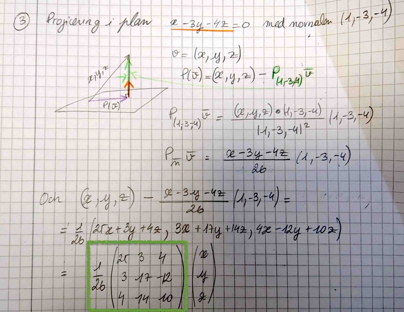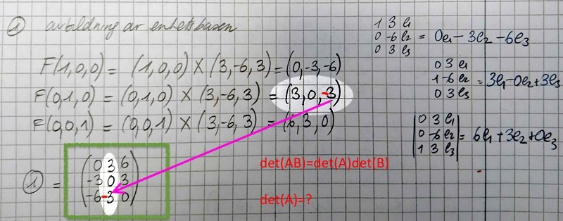 Bestäm determinanten av matrisen för den linjära avbildning som definieras av att bildas genom att först v avbildas på , för vektorn , sedan speglas denna kryssprodukt i planet , sedan projiceras denna spegelbild på planet , och till sist vrids denna projektion vinkeln runt linjen (Du kan själv bestämma åt vilket håll vridningen sker). (Positivt orienterat ON-system.) Räkna determinanten.