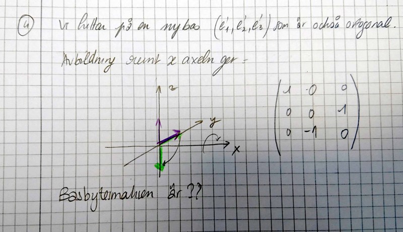 Jag frågar för jag har funderat ganska länge på det idag i en uppgift, där vi hade koordinat i basen , som vi skulle utrycka i basen , och eftersom vi hade