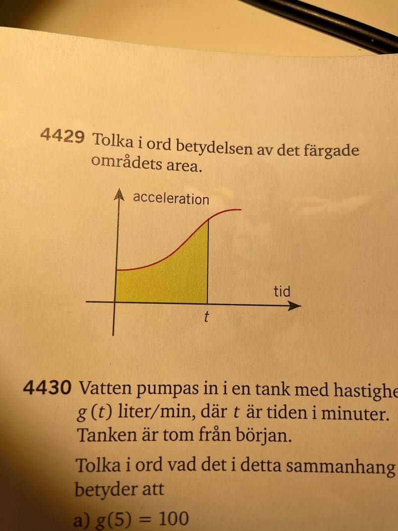 Teraeagle skrev:Kurvan beskriver den momentana hastighetsökningen, t.ex. ”just nu ökar hastigheten med 10 m/s2”. Arean beskriver hur hastigheten har ändrats totalt sett. Om arean motsvarar 10 m/s så betyder det att hastigheten är 10 m/s högre vid tiden t jämfört med tiden 0.