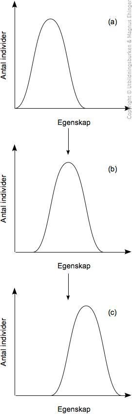 Betrakta bilden till höger. Den visar hur fördelningen av en viss egenskap hos en ursprunglig population varierar över tiden. Vilka tre av följande påståenden om denna process är sanna? (2p)Egenskapen som avses på x-axeln genomgår divergent evolution.