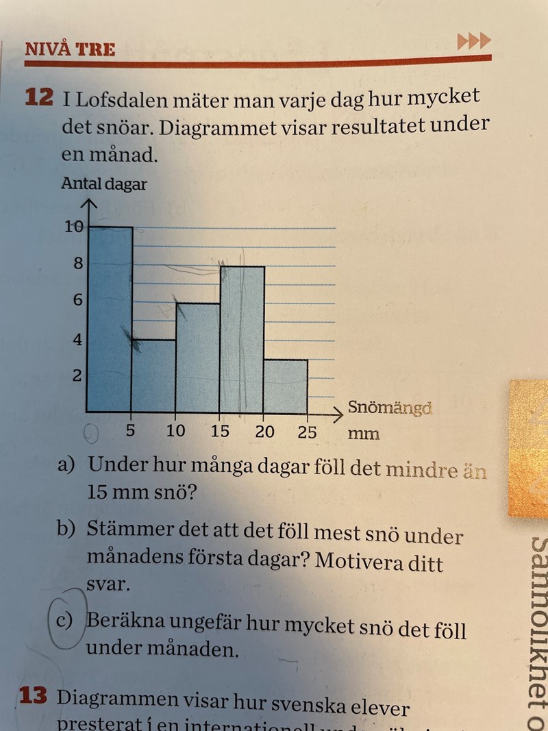 Så här kan du börja: Stapeln längst till vänster visar att det under 10 dagar föll mellan 0-5 mm snö. Hur mycket blir det totalt, i snitt eller uppskattningsvis?