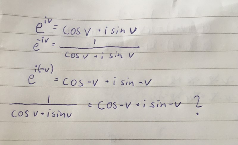 1cos(v)+isin(v)·cos(v)-isin(v)cos(v)-isin(v)=cos(v)-isin(v)cos2(v)+sin2(v)=\dfrac{1}{\cos(v)+i\sin(v)}\cdot\dfrac{\cos(v)-i\sin(v)}{\cos(v)-i\sin(v)}=\dfrac{\cos(v)-i\sin(v)}{\cos^2(v)+\sin^2(v)}= cos(v)-isin(v)=cos(-v)+isin(-v)\cos(v)-i\sin(v)=\cos(-v)+i\sin(-v)