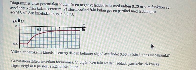 det jag har tolkat är att det finns en negativ partikel med en positiv partikel runt om, vid en punkt då har den positiva partikeln lägesenergin 6nJ ( vad innebär lägesenergin i detta fall) och närmar eller förskjuts den positiva partikeln så att den kinetiska energin ändras men då ökat fältets energi mot partikeln ? Stämmer det ?