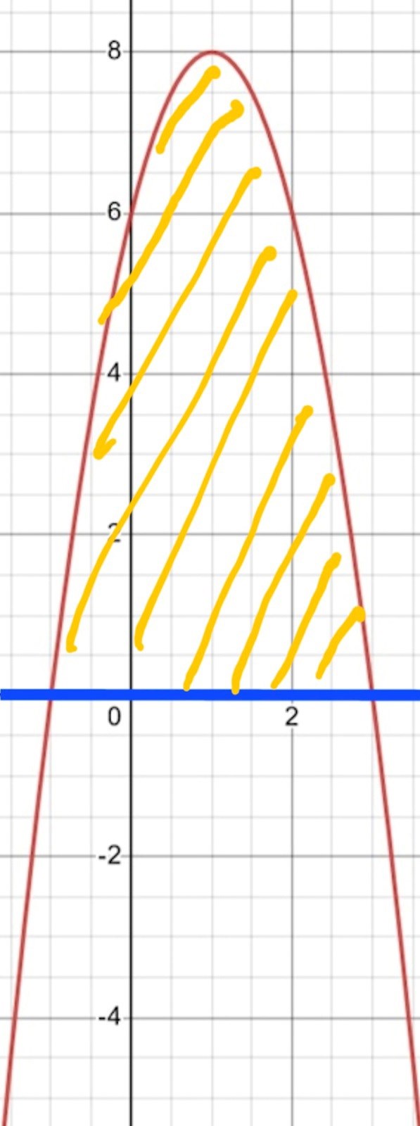 - "begränsas nedåt av x-axeln" innebär att den undre begränsningen är den blåa linjen.