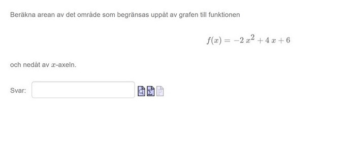 Jag har fastnat på följande uppgift, vet inte hur jag ska tolka den. Jag började med att hitta rötter till f(x) som är x1=3, x2=-1. Det bekräftade jag genom att kolla grafen till f(x). Jag är osäker vilket område jag ska räkna eftersom på uppgiften står det 'uppåt av grafen till funktionen och nedåt av x-axeln'