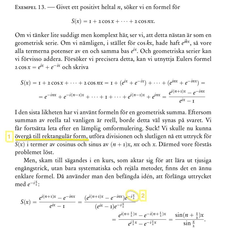 2. Exponenterna blir i(n+1-½)x = i(n+½)x respektive i(n-½)x. Varför har du delat n med 2?