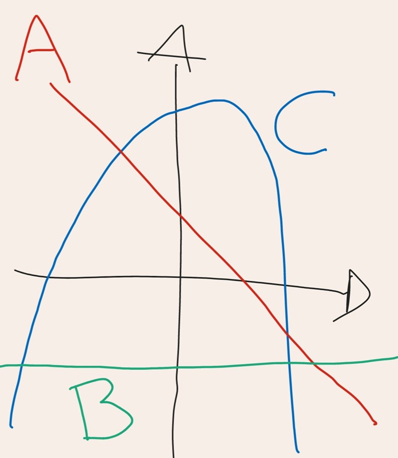 Vilken av A, B och C verkar vara från en tredje, en andra respektive en förstagradsfunktion?