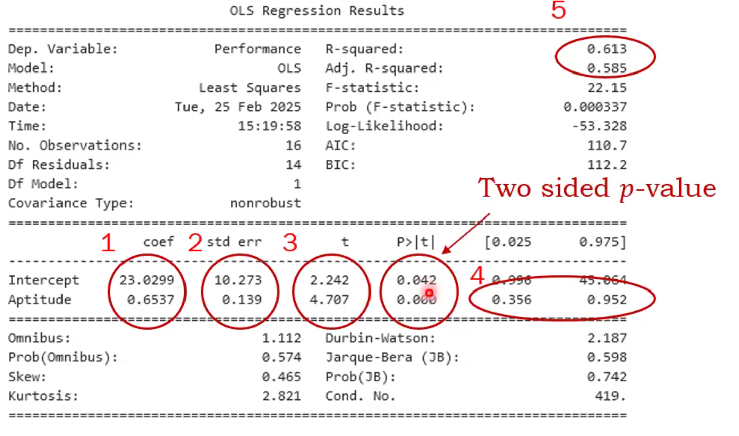 I cirkeln mellan 3 och 4 ser det ut som att p-värdet för den observerade lutningskoefficienten b1 är 0.000. Vad innebär det? Innebär det att det observerade värdet hade varit i den 0.000:e percentilen ifall regressionen hade stämt? Dvs nollhypotesen att regressionen stämmer motbevisas? Eller vad innebär det?