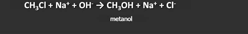 Visst visar den här reaktionsformeln att klormetan reagerar med natriumhydroxid och bildar metanol och natriumklorid?