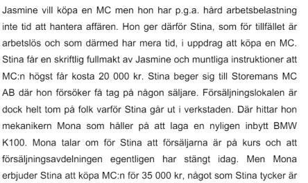 Hur tolkar ni den skriftliga fullmakten? Det står inte vad den skriftliga fullmakten innehåller (står bara "får en skriftlig fullmakt") men ska jag tolka det som att det står att hon ska köpa en MC eller som att det står att den även högst får kosta 20 000 kr eller säger hon enbart det till Stina?