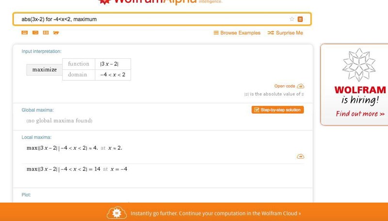 så får jag dessa värden, men när jag skriver http://www.wolframalpha.com/input/?i=abs(3x-2)+for+-4%3Cx%3C2... så får jag liksom helt annorlunda värde. Så vad är då rätt slash fel?