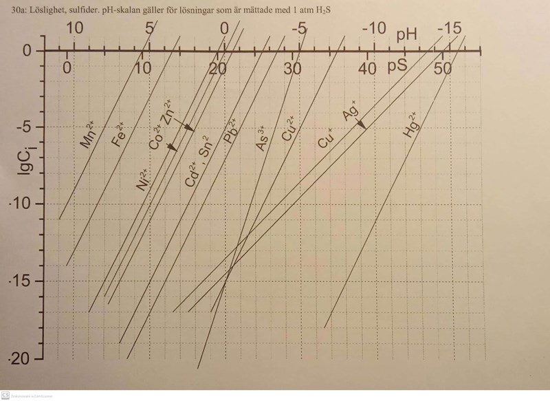 Jag har suttit rätt länge med det här. Jag vet vilket diagram jag ska använda för att lösa uppgiften men jag förstår inte hur jag använder informationen i frågan för att med hjälp av diagrammet avläsa vilka föreningar som kommer fällas ut? Var lgCi logaritmen av koncentrationen?