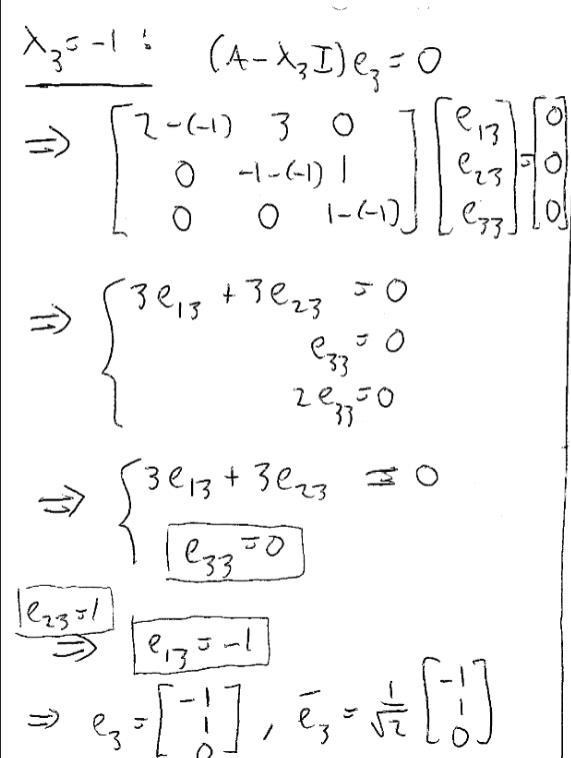 När man har tagit bort egenvärdet från diagonalen har man gjort 3 ekvationer till max 2, men du har fortfarande 3 okända, så det är underbestämt. Är det överbestämt så finns ingen lösning till allihop.