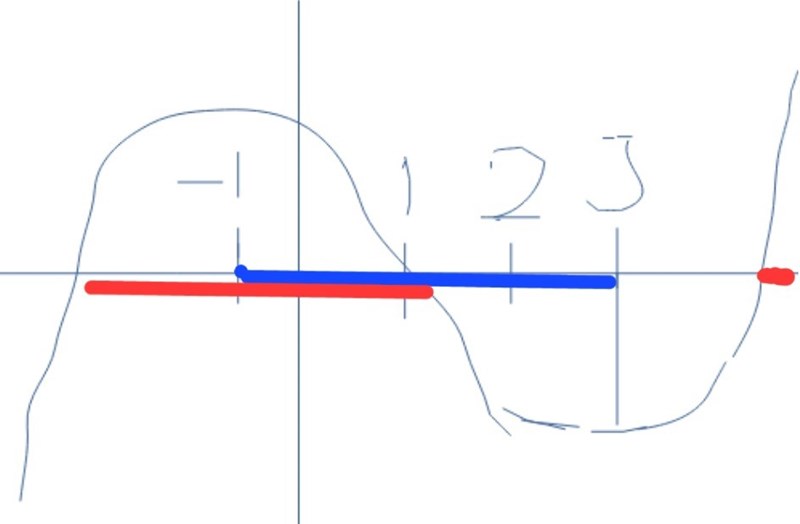 Tack för förtydigandet, då vet o förstår jag. "Glömde" att f (x) lika med eller större än 0 var på eller över x-axeln. Jag tänkte att det var positivt i första kvadranten o då svarade i intervallet 0-3 men efter 1 så är ju inte f(x) större än eller lika med 0 då den ligger under x-axeln.