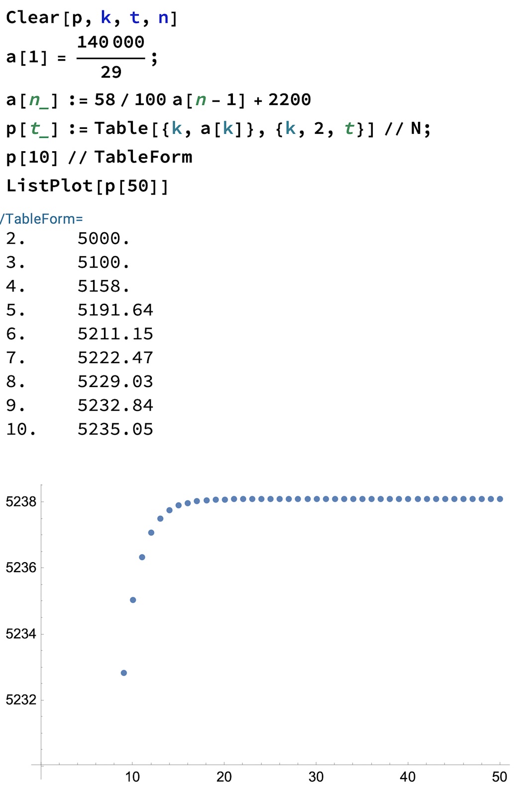 När det står "ett år" tolkar jag det som a1 = 5000 och därefter a(n-1) = 0,58 * an + 2200. Enligt facit är detta fel. a0 = 5000.
