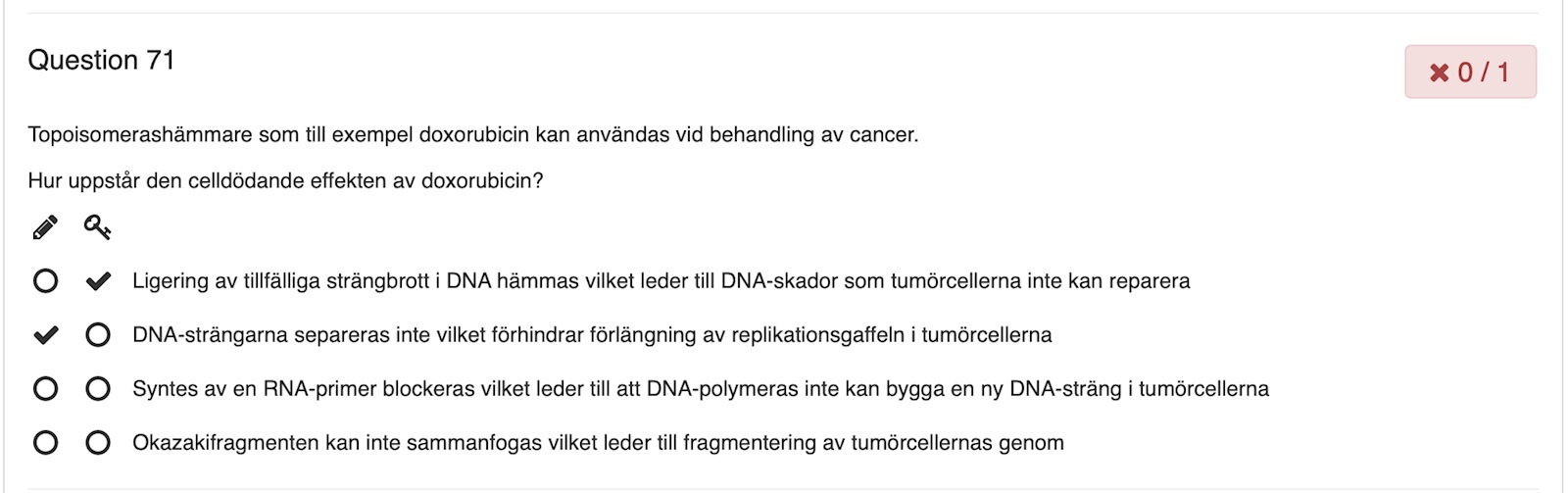 mag1 skrev:Fast alternativ a) stämmer inte alls med inhibitionen av topoisomeras (eller mer specifikt topoisomeras II, som är den typ av topoisomeras som doxorubicin inhiberar). Topoisomeras II har främst rollen att möjliggöra separationen av strängarna under replikationen.