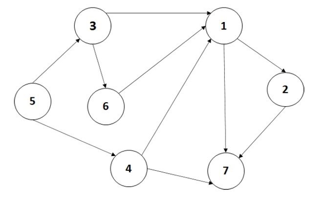 Kan någon förklara varför 6, 1, 5, 3, 4, 2, 7 inte är en möjlig topologisk sortering för grafen nedan?