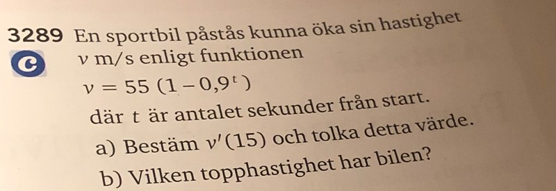Jag har lite problem med b) där topphastigheten ska bli 55m/s. För att få en topp hastighet så krävs det att y-värdet för maxipunkten ska vara störst.
