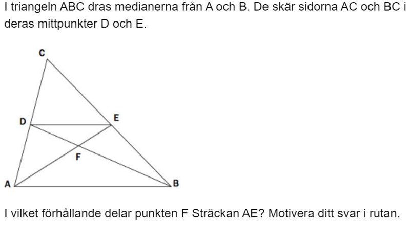 Efter detta vet jag inte hur jag ska fortsätta och kunna få ett förhållande på sträckorna i medianen. Förstår inte heller vad topptriangelsatsen ska hjälpa mig i sammanhanget.