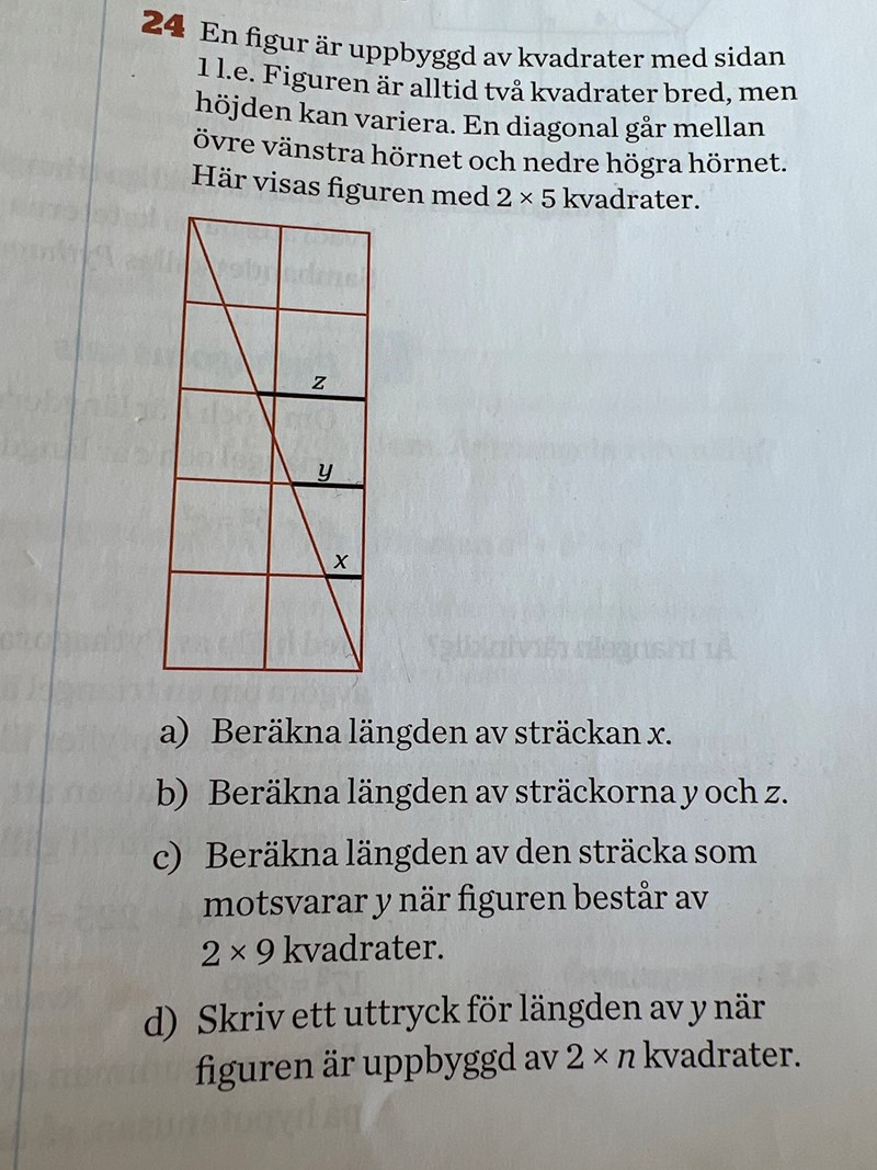 Hej! Jag förstår absolut ingenting av denna fråga. Hur ska jag beräkna sträckan X? C) fattar jag inte hur figuren ska bestå av 9 kvadrater. Jag har försökt klura ut den på något sätt men det går inte. Är verkligen tacksam för all hjälp:)