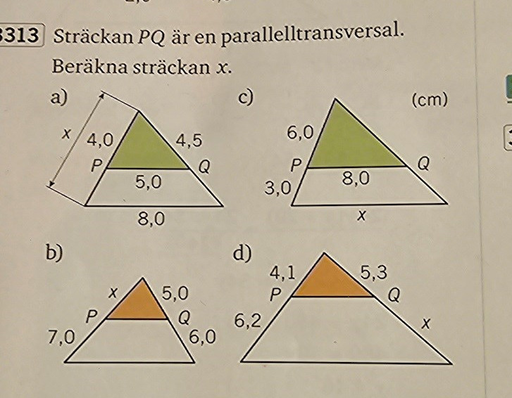 men ang. den första t'nker jag att om man anv'nder transversialsatsen skulle man inte då inte behlva ta längden på hela sidan alltså x +4?