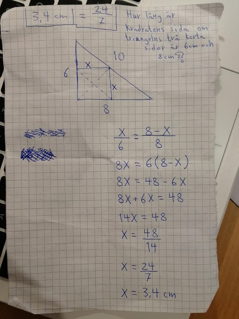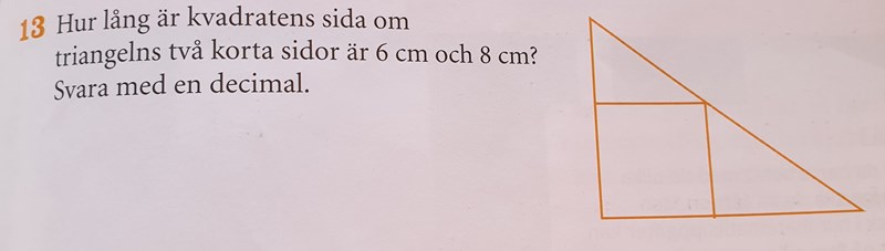 Är det här inte gymnasienivå? Iallafall du vet hur förhållanden mellan sidor fungerar i triangel/trianglar? Är det möjligt att lösa uppgiften genom att använda sig av kvadratens ena sida x som motsvarighet till den stora triangels 8. Samt kan du använda triangels sida 6 samt x för att få ett uttryck för förhållanden mellan den stora triangeln samt den mindre triangeln.