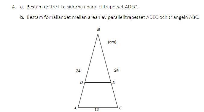 Svar på uppgift 4 a) "De tre lika sidorna i parallelltrapetsen ADEC är 8 cm
