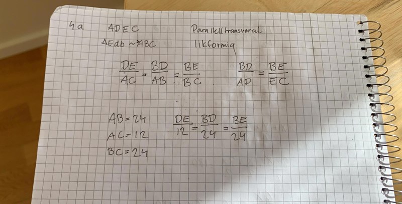 Vad är detta för uppgift? Jag ser inte att det går att avgöra paralelltransversalen skär triangeln. Det ges ingen information om var D ligger på AD.