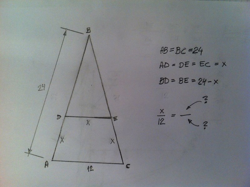 Det blev inte riktigt rätt. Om du har x som sidan i parallelltrapetsen så vad är sidan på den lilla triangels sida.