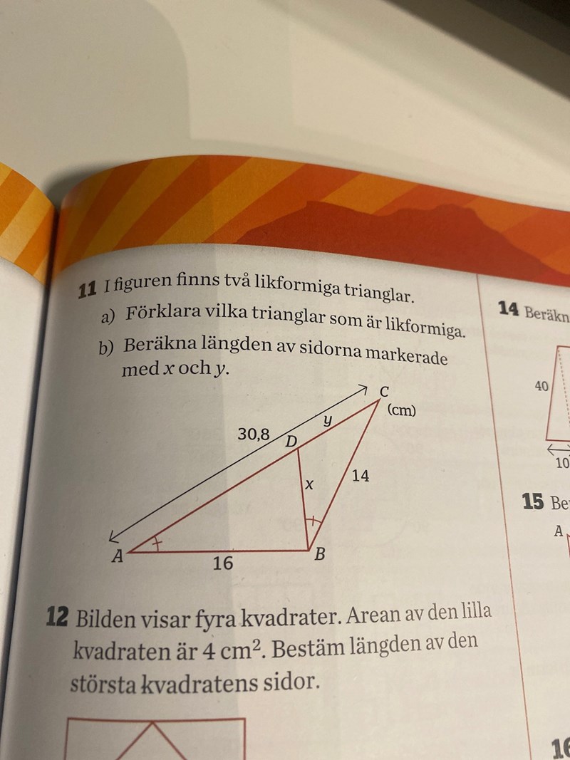 Jag har lyckats att lösa a) och på B) har jag löst x. Men y förstår jag inte riktigt. Jag vet att det ska vara y/14=14/30,8 men vet inte varför