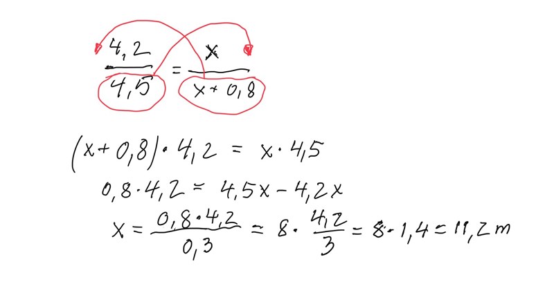4,2/4,5=X/(X+0,8)   och vet att X+0,8= Mastens hela höjd.