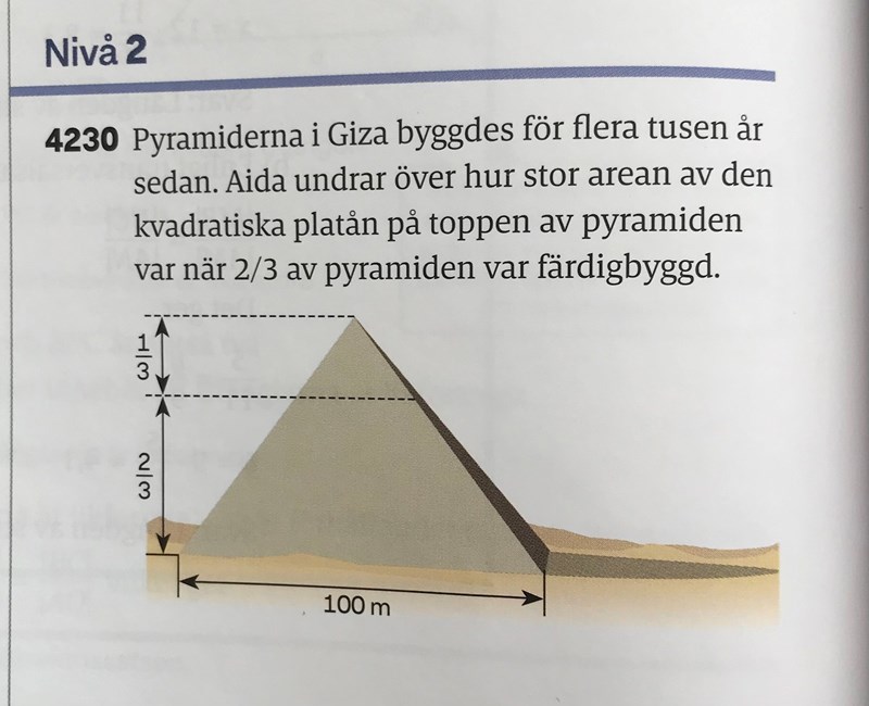 Höjden på den lilla pyramiden är 1/3 av den stora alltså är arean av basytan på den lilla