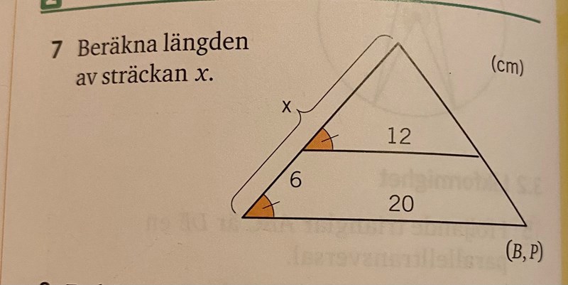 Du har tagit fram ekvationen xx-6=1220\frac{x}{x-6}=\frac{12}{20}. I den första kvoten har du sidorna för de båda trianglarna, stora/lilla, men i den andra kvoten har du baserna, lilla/stora. Vänd på den ena så att båda blir "på samma håll", då kommer det att funka.