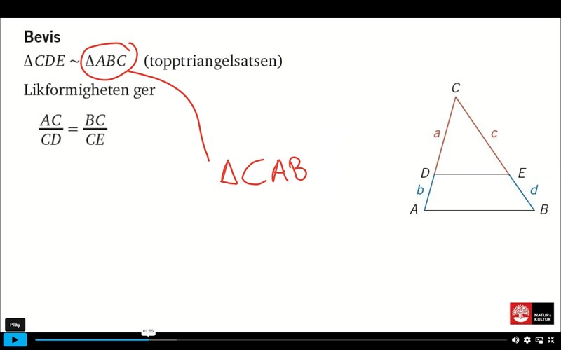 I denna videoklipp säger han att CDE är likformig med ABC, han menar väl att topptriangeln är likformig med den stora, eller har jag uppfattat det fel?