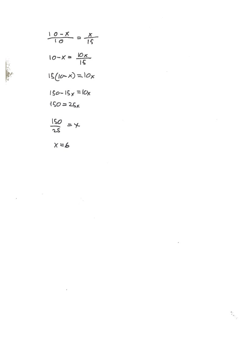Ställ sedan upp ekvationen 10-x/10 = x/15 med hjälp utav topptriangelsatsen.