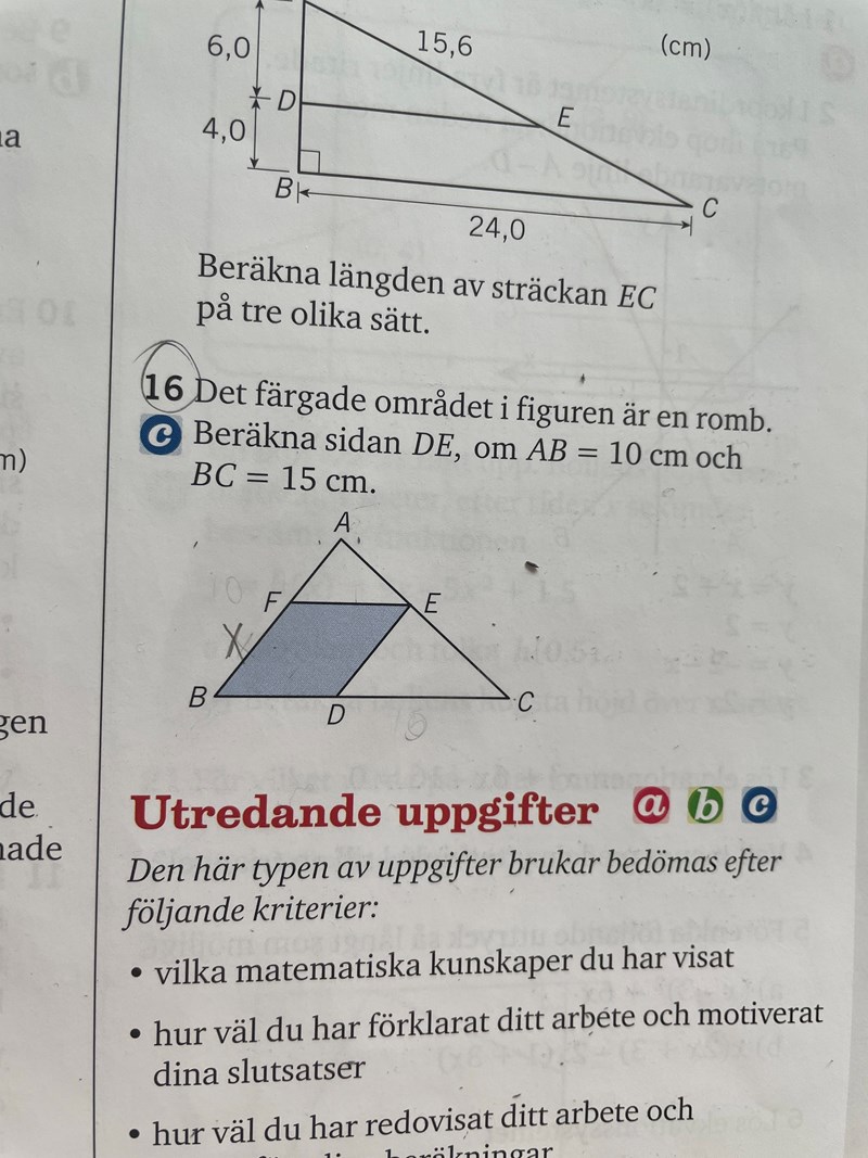 Jag har försökt lösa uppgift 16 med topptriangelsatsen, en romb har alla sidor lika men eftersom jag bara har 2 sidor av triangeln så står det fast hos mig. Läst andra trådar ang detta problem men inget hjälper riktigt, skulle någon kunna ge ett konkret exempel på vad man kan göra för att förstå?