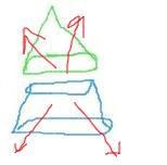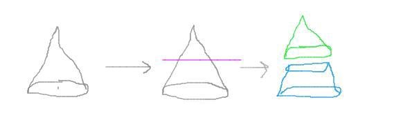 Det är otydligt i din bild vad du menar med toppytan. Du har två vågräta blå ytor - pilarna skall gå uppåt från den övre, och neråt från den undre. Den gröna pyramiden är inte inblandad alls (men den blåa stympade pyramidens toppyta är lika med den gröna pyramidens bottenyta).