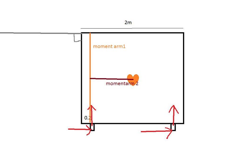 Moment-ekvationen beräknas runt den punkt där vänstra foten möter golvet, eftersom lådan har vridnings-centrum runt denna fot. Låda vrider sig alltså runt denna punkt. Fothöjden skulle vi anta vara noll. Momentarmen för "" är då 2m lång