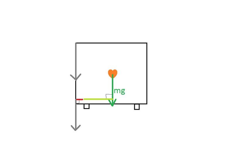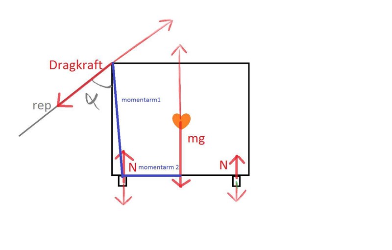 Jag måste räkna ut vridmoment för en låda. Jag har gjort en lite schema för uppgiften, oranga hjärtat är masscentrumet.