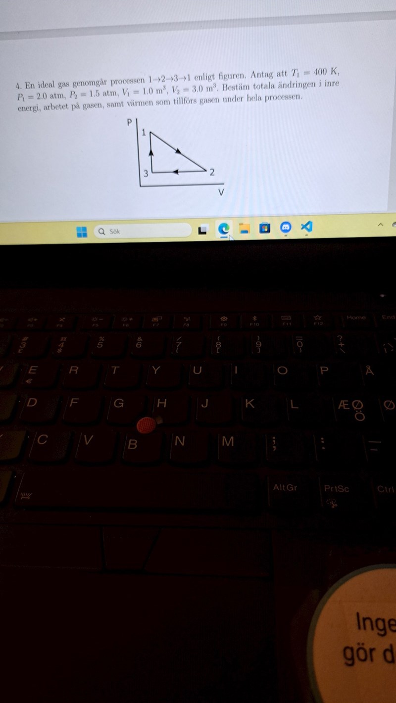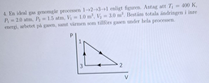 Okej. Hur vet du att P_3=P_2 och V_3=V_1? Jag hänger inte med nu. I punkten 1 är P_1=2 atm och P_2= 1.5 atm.