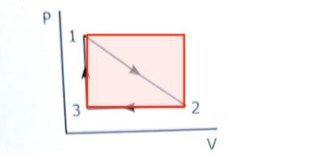 Det är arbetet W som är triangelns area i pV-diagrammet. Det är summan av dessa integraler. Eller man räknar ut det som halva rektangels area.