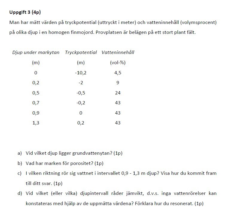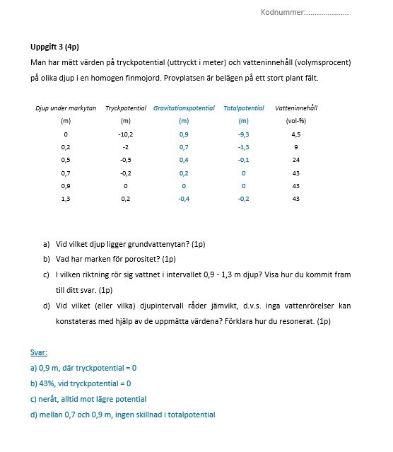 Jag förstår inte hur jag ska lösa uppgift c) och d) nedan. I facit har man räknat fram totalpotential och lägespotential (anges i blått) för att svara på frågorna. Totalpotentialen förstår jag hur jag ska räkna ut om jag har både läges- och tryckpotentialen. Men hur kommer man fram till lägespotential när man endast vet djup, tryckpotential och vatteninnehåll?