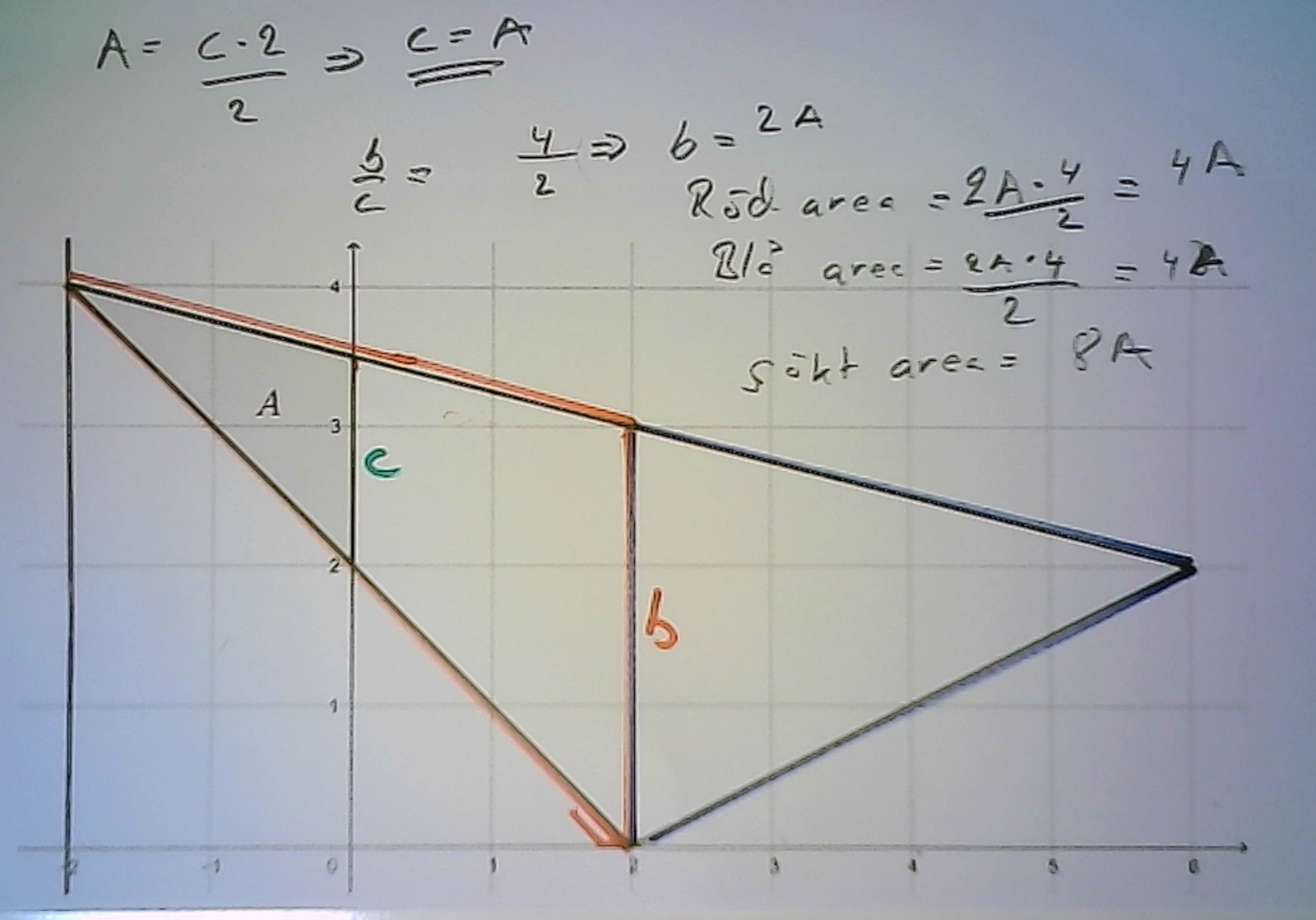 Som vanligt är det bra att rita. Det framgår av frågeformuleringen att punkten längst åt vänster kan ligga var som helst i y-led, så jag ritade två olika trianglar. Båda kan delas upp i 8 trianglar, alla har inte samma form, men alla har (den vågräta) höjden 2 och (den lodräta) basen är gemensam i vardera trianglen, så alla trianglar har samma area, nämligen A. Svaret är att den stora trianglen har arean 8A. Skulle detta vara en provfråga skulle jag ta fram ett uttryck för basen, men just nu tycker jag att det räcker att se att baserna är samma i vardera fallet.