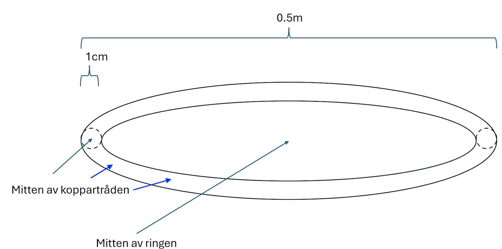Ringens omkrets är typ 1,5 meter. Det är koppartrådens (kanske mer kopparstavens) längd.